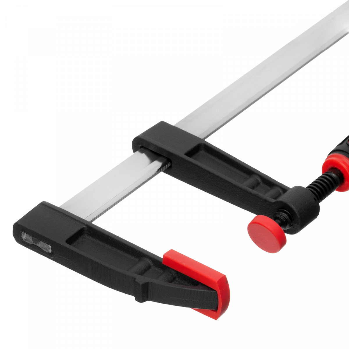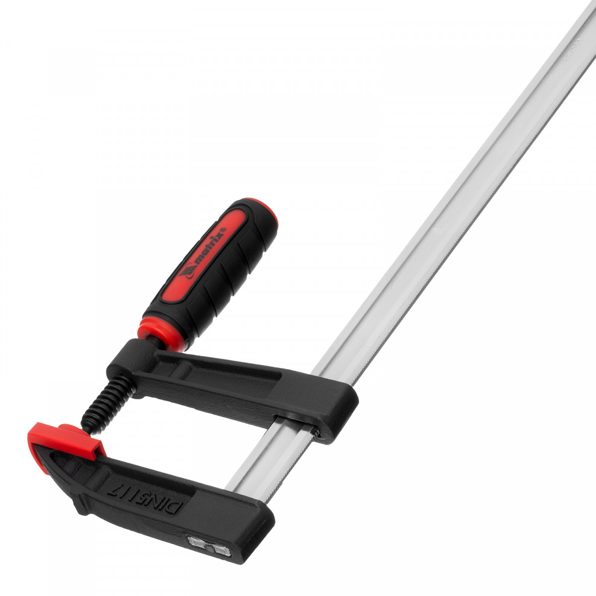 Усиленная F-образная струбцина Matrix 20406 размером 300 х 80 х 380 мм используется для зажима металлических, деревянных и других заготовок для их последующей обработки или сборки. Представляет собой штангу, на которой установлены 2 кронштейна — неподвижный и подвижный. Деталь помещается между ними и прижимается к губкам при помощи винтового зажима с трапециевидной резьбой. Величина захвата регулируется при помощи подвижного кронштейна и может достигать 300 мм. Струбцину используют для проведения слесарных и столярных работ. Металлическая конструкция выдерживает высокую температуру, поэтому инструмент пригодится для выполнения сварочных работ (перед началом необходимо снять пластиковые накладки с губок).