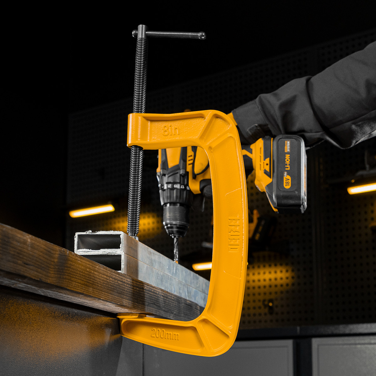 G-образная струбцина Denzel 20646 с максимальной шириной зажима 200 мм используется для фиксации заготовок или закрепления их на верстаке, станке или между собой. Позволяет склеивать детали, а также сверлить их, шлифовать, опиливать и проводить другие работы. Может использоваться во время выполнения сварочных работ. Винт с трапециевидной резьбой обеспечивает надежную фиксацию предметов. Струбцина применяется в слесарном и столярном деле, будет полезна также домашнем хозяйстве.