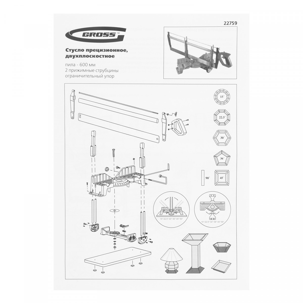 Двухплоскостное прецизионное стусло Gross 22759 с пилой 600 мм, 2 прижимными струбцинами и ограничительным упором позволяет осуществлять распил заготовок в двух плоскостях. Оно обеспечивает высоту распила 165 мм и ширину 175 мм. Рассчитано на профессиональное использование при проведении столярных работ.