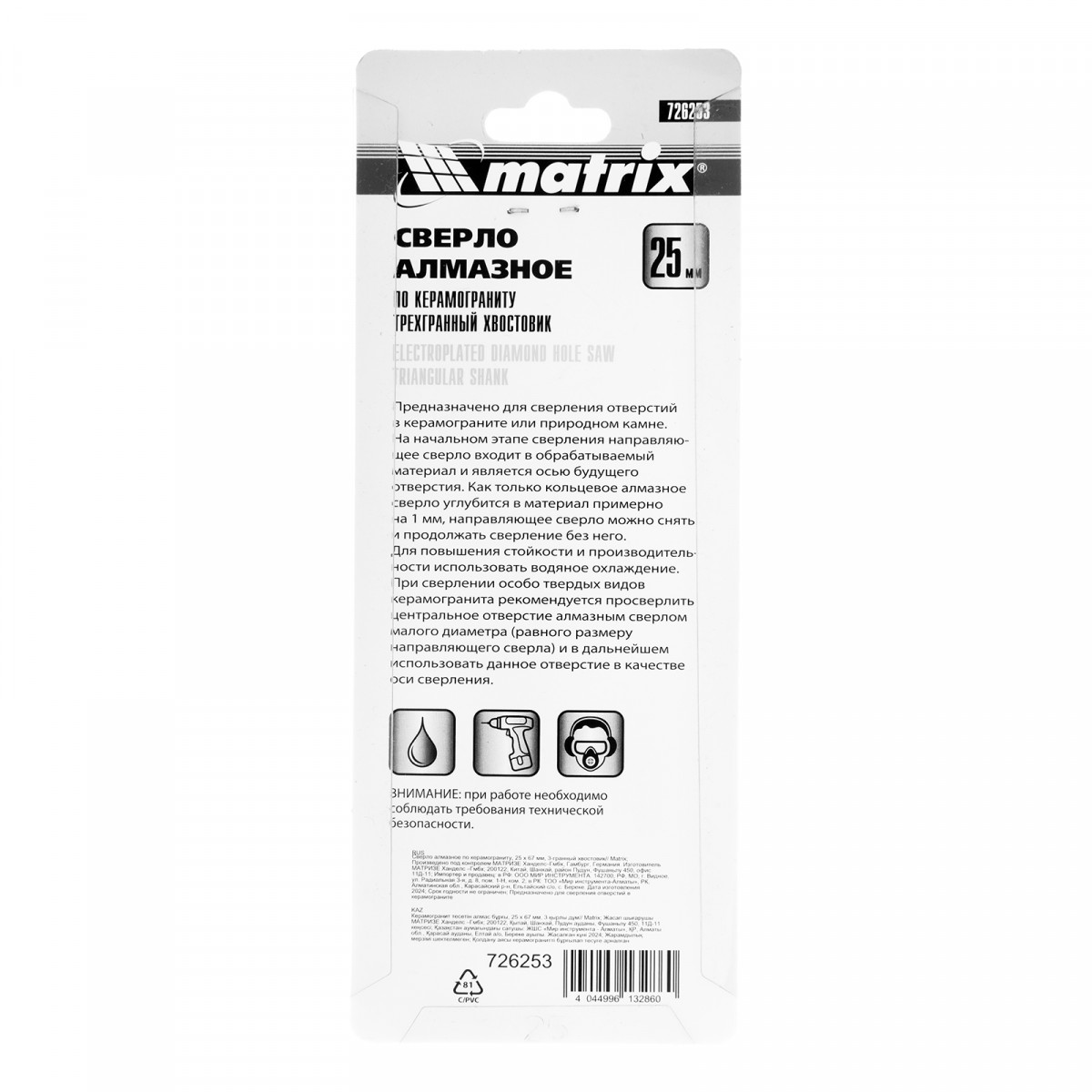 Универсальное алмазное сверло по керамограниту Matrix 726253 размером 25 х 67 мм, с 3-гранным хвостовиком, применяется для получения отверстий в стекле, плитке, кафеле. За счет высокой концентрации алмазов в режущем слое оно легко справляется со сверлением керамогранита. Сверло рассчитано на профессиональное использование с дрелями и шуруповертами. Водяное охлаждение в процессе работы значительно повышает срок службы оснастки.