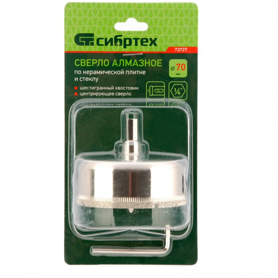 Сверло Сибртех 72727 размером 70 х 55 м, с шестигранным хвостовиком и центрирующим сверлом, позволяет получать отверстия в керамической плитке и стекле. Его устанавливают на дрель или шуруповерт, рекомендуемый диапазон рабочих оборотов 350-700 об/мин. Оснастка используется при выполнении бытовых ремонтных и отделочных работ.