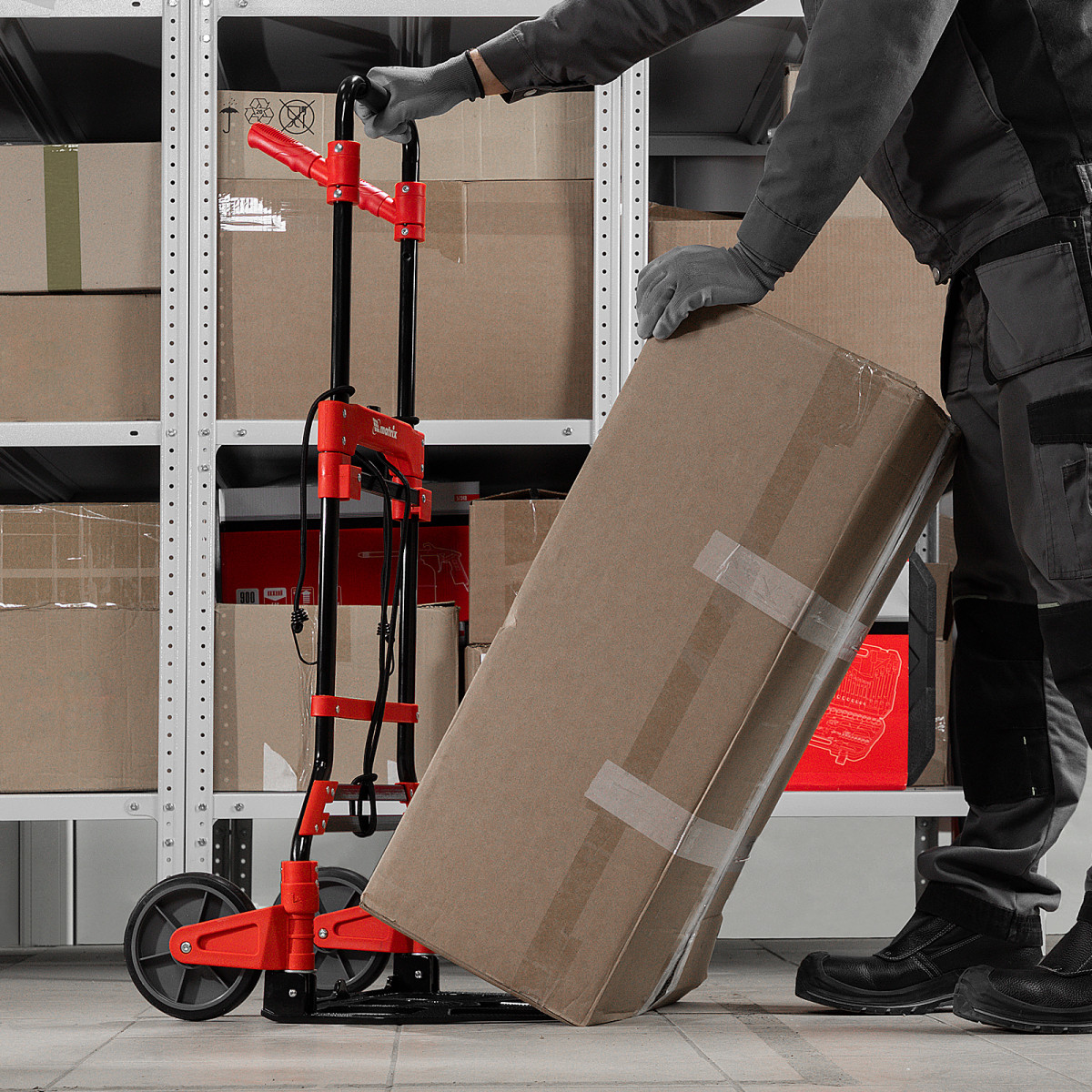 • Удобное хранение и транспортировка — платформа и колеса складываются, поэтому тележка не занимает много места.