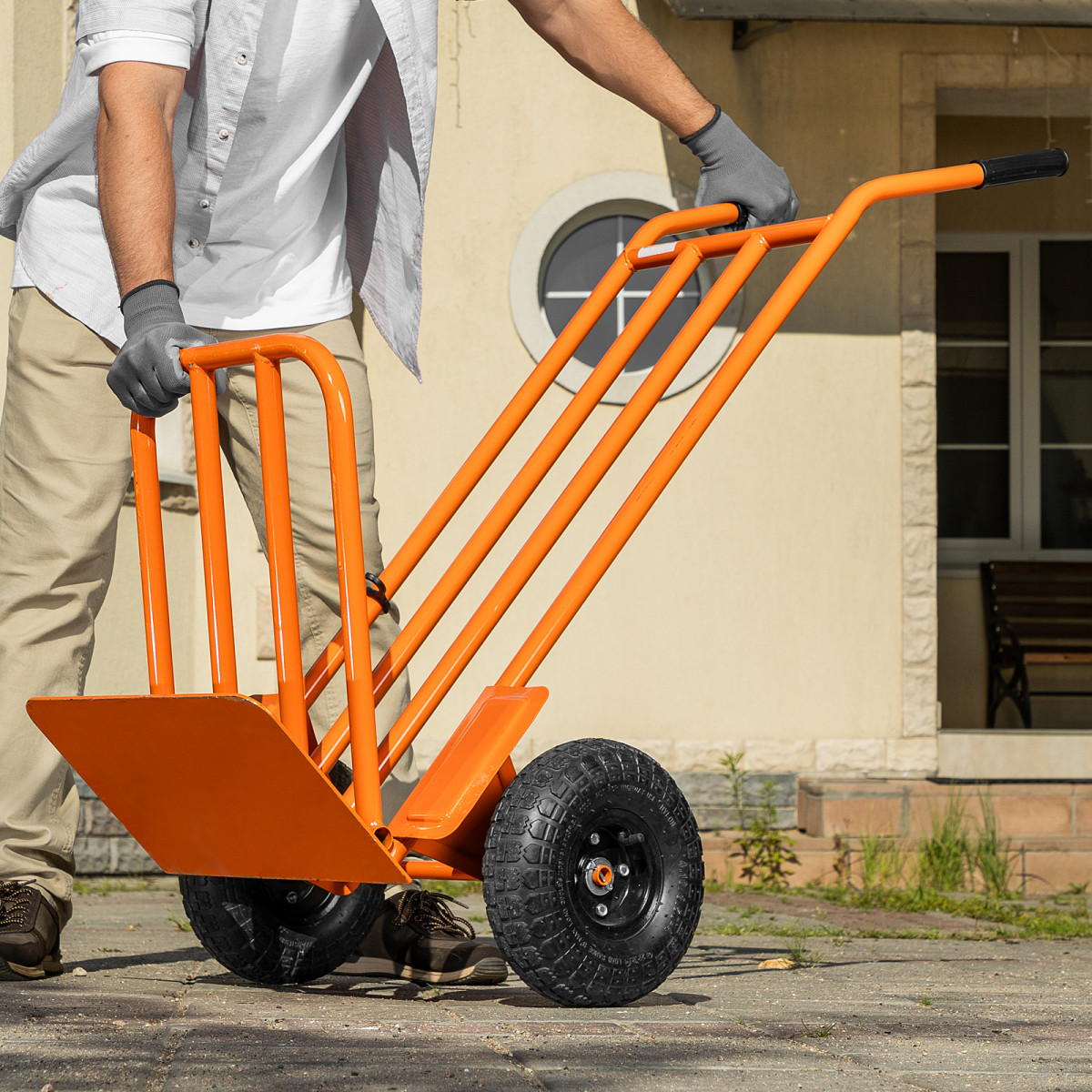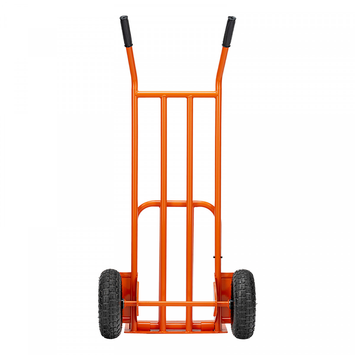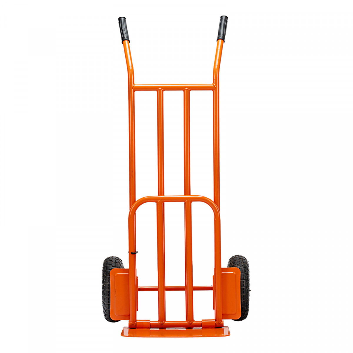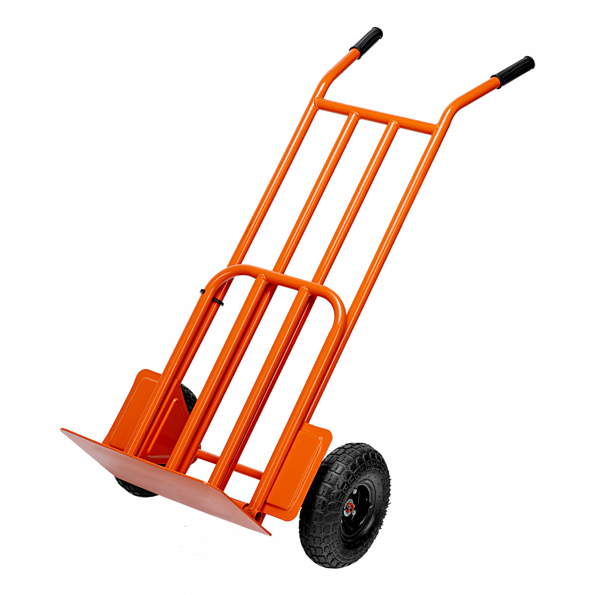 Ручная двухколесная тележка Сибртех 69302 с пневматическими колесами диаметром 260 мм и откидной платформой размером 530 х 400 мм имеет усиленную конструкцию и используется для перемещения крупных грузов массой до 250 кг. Пригодится на складе и на производстве.