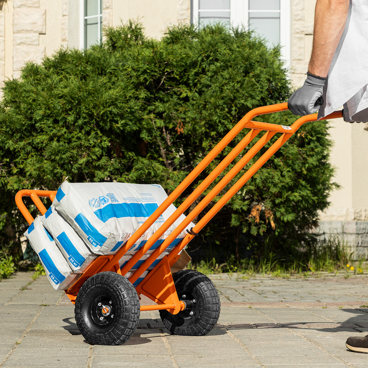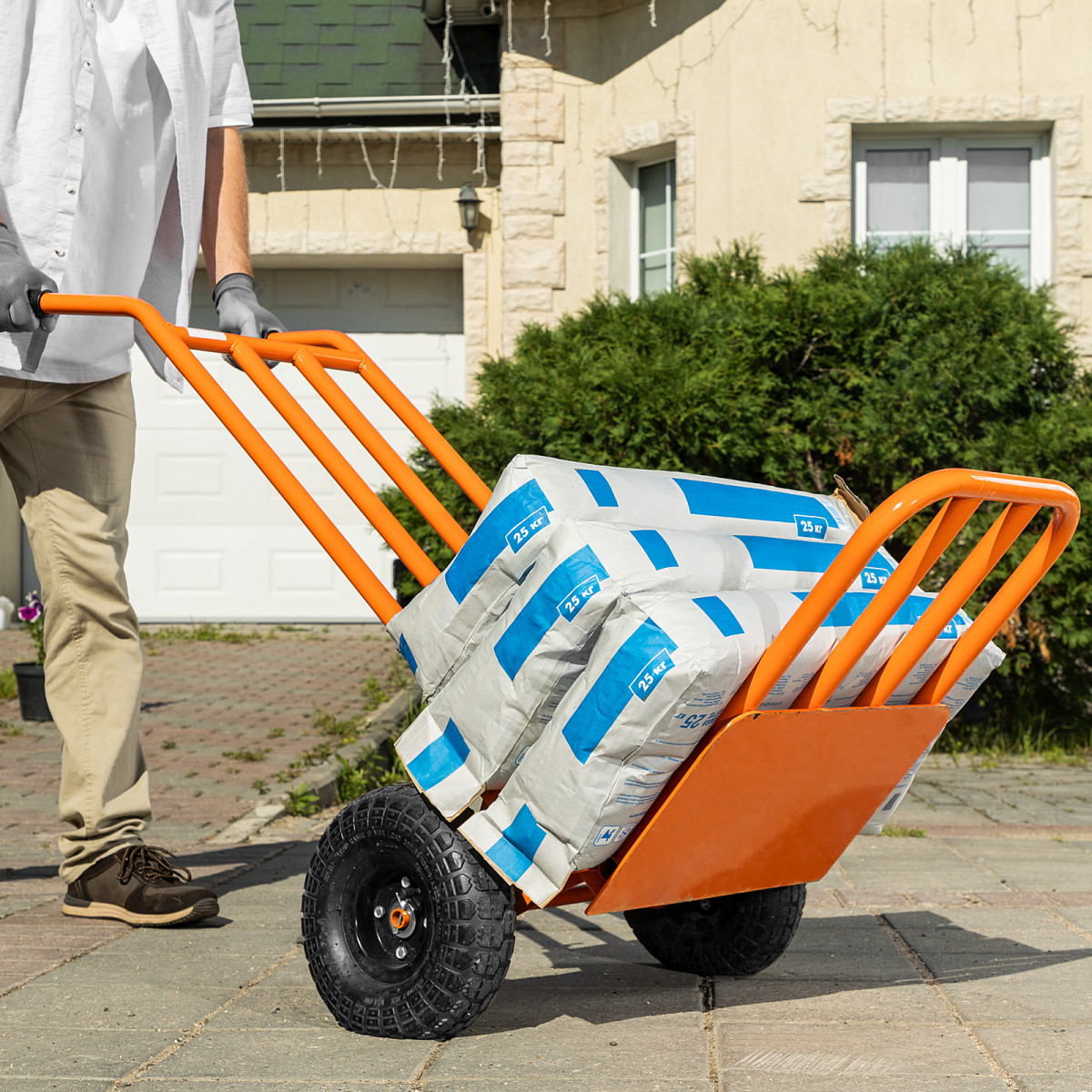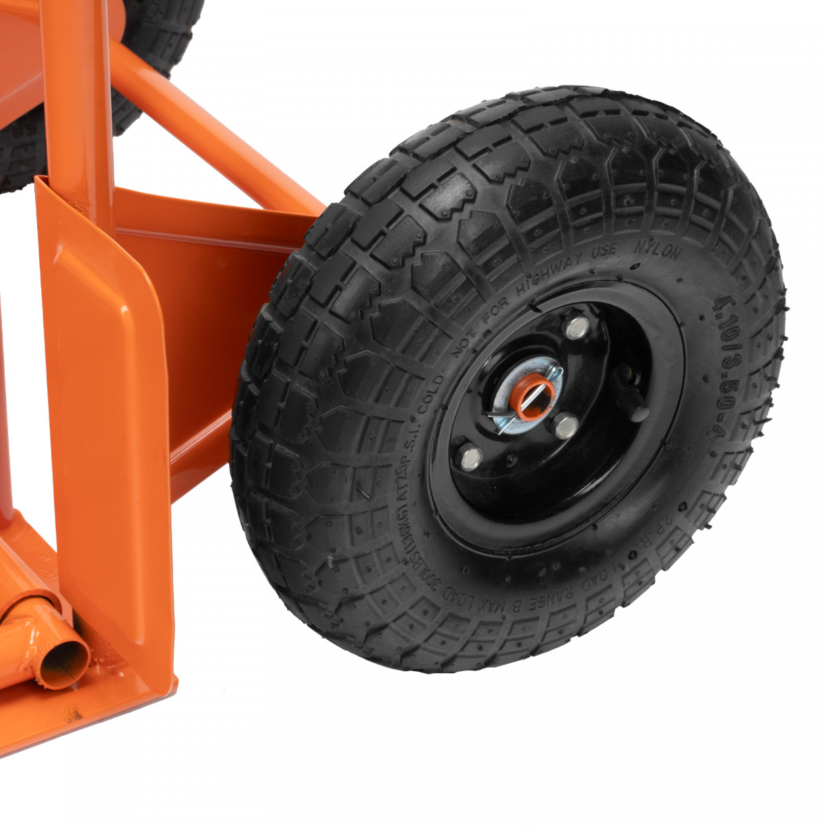 • Удобная транспортировка груза — пневматические колеса с камерами, резиновыми шинами и 2 шарикоподшипниками в каждом гасят вибрации и обеспечивают плавный ход.