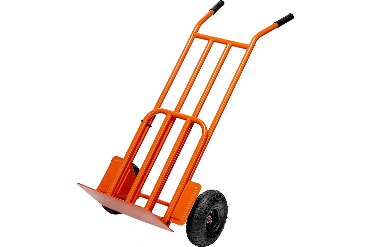 Ручная двухколесная тележка с пневматическими колесами диаметром 260 мм и откидной платформой размером 530 х 400 мм имеет усиленную конструкцию и используется для перемещения крупных грузов массой до 250 кг.