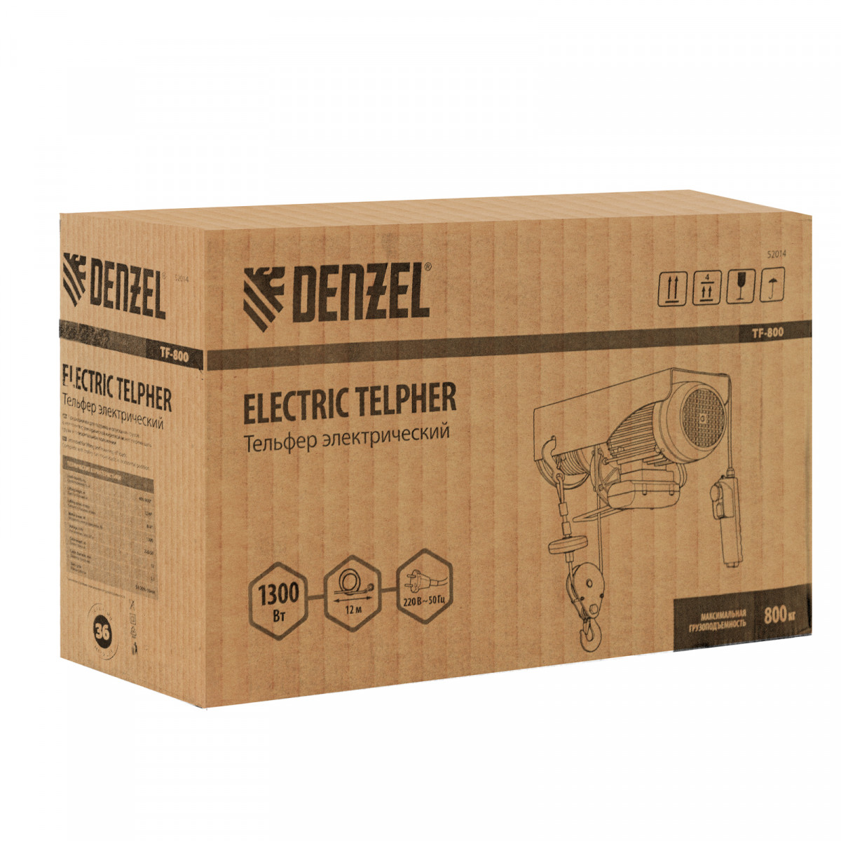 Электрический тельфер Denzel TF-800 52014 мощностью 1300 Вт способен поднимать автомобильные двигатели, строительные материалы и другие грузы массой до 0,4 т напрямую и до 0,8 т с помощью блока полиспаста. Высота подъема составляет 6 м при использовании полиспаста и 12 м без него, скорость — 4 и 8 м/мин соответственно. Устройство пригодится в гараже, автомастерской или на строительной площадке. Полиспаст входит в комплект поставки.