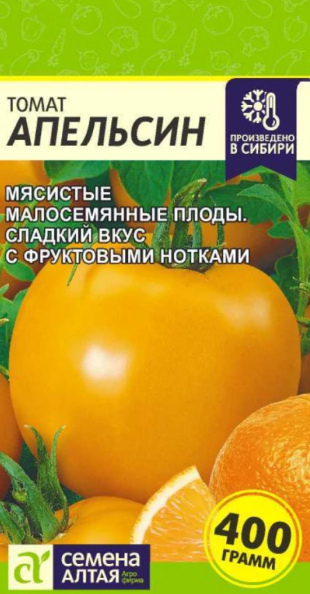 Среднеспелый сорт с плодами, по цвету и форме напоминающими апельсин. Куст индетерминантный, высотой 1,3-1,5 м. Первое соцветие закладывается над 8-9 листом, последующие через 3 листа. Плоды крупные, массой 180-230 г, до 400 г, с малым количеством семян, мясистые. Вкусовые качества отличные.