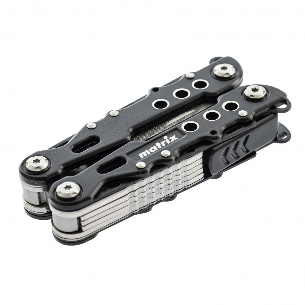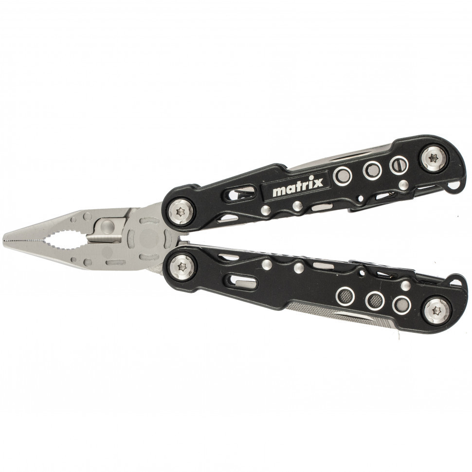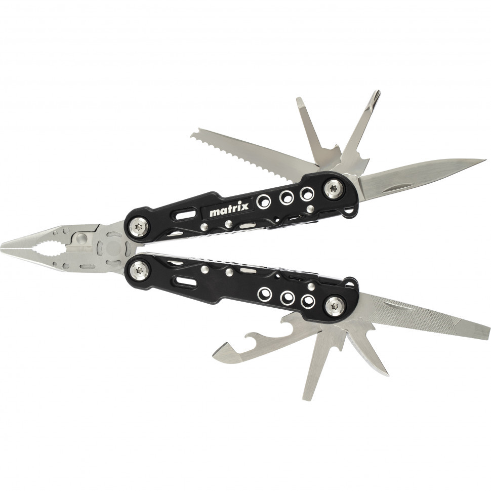Трансформер Matrix 17622 — это мультитул длиной 165 мм с 13 функциями и авторазжимом, поставляется с чехлом. Его можно использовать в гараже — он включает длинногубцы с кусачками и захватом полукруглых предметов, а также отвертки. Инструмент пригодится в походе, на рыбалке или охоте, поскольку имеет в составе нож, пилу, открывалку и консервный нож. Благодаря пилке для ногтей мультитул будет полезен в быту.