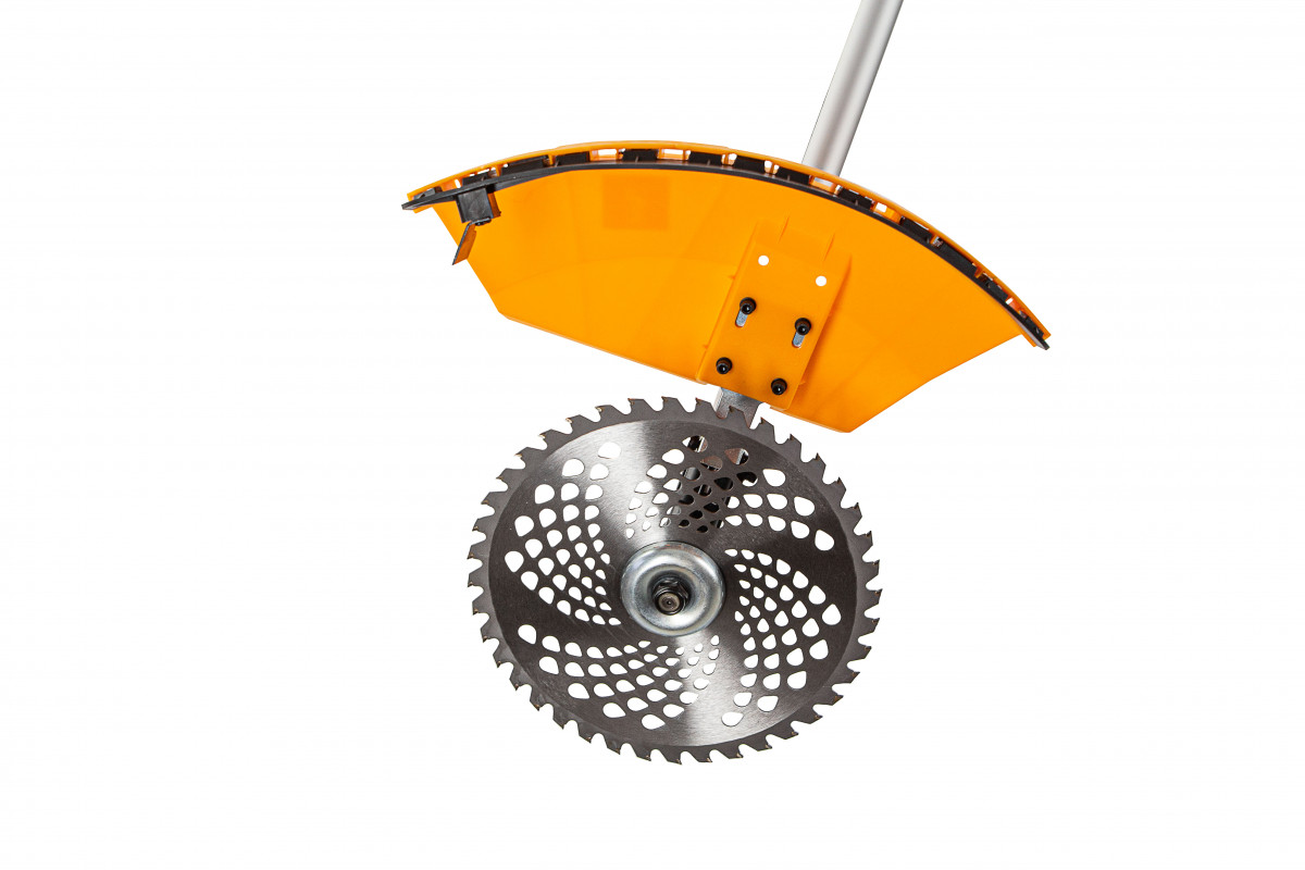 - Дополнительные возможности — можно приобрести и установить на триммер диск Denzel 96323 для быстрого удаления растительности с жесткими стеблями, 96328 для скашивания молодых побегов кустарника диаметром до 3 мм.