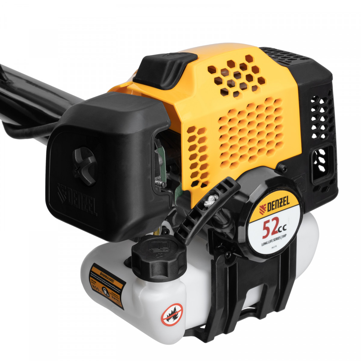 Бензиновый триммер Denzel DGT-52-PRO 96278 с системой анти-вибро и неразъемной штангой состоит из 2 частей и оснащен мощным двигателем объемом 52 куб. см. Способен скашивать не только газонную траву, но и растительность с жесткими древовидными стеблями (полынь, крапиву, лебеду, борщевик), а также срезать кустарник и молодые побеги деревьев со стволами диаметром до 10 мм. Для этих целей предназначены полуавтоматическая катушка с леской, трехлопастный нож и пильный диск.