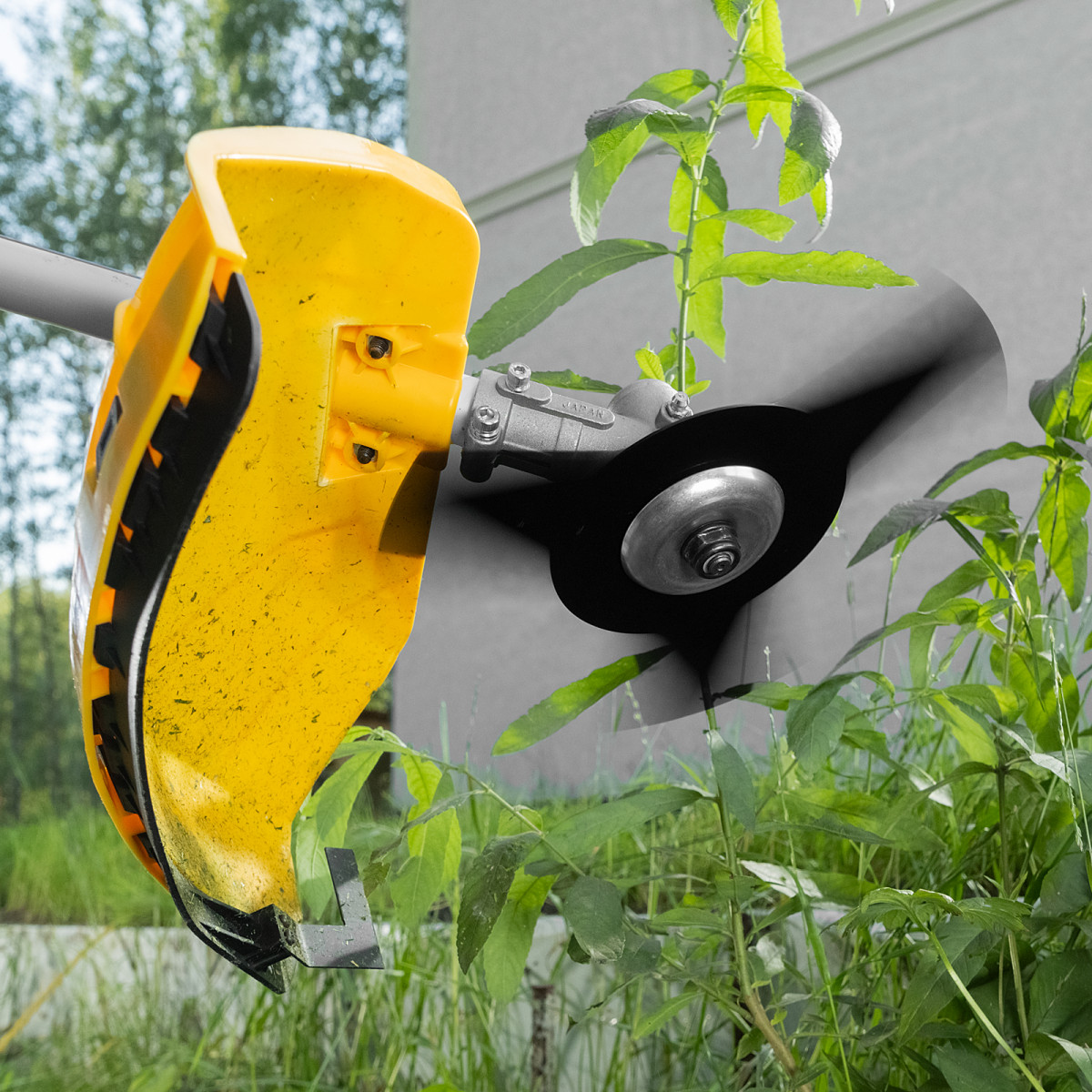 • Безопасность — блокировка выключателя препятствует случайному запуску, а защитный кожух предохраняет от летящей травы.