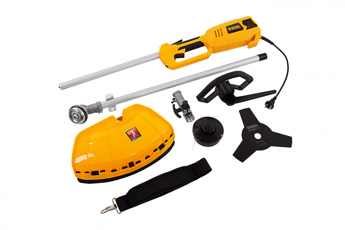 Электрический триммер Denzel TE-1220 96642 мощностью 1200 Вт, с разборной штангой, катушкой и диском, предназначен для скашивания травы различных типов, в том числе с жесткими стеблями: полыни, крапивы, лебеды. Мощный двигатель обеспечивает вращение катушки и диска со скоростью 7500 об/мин. Ширина скашивания за один проход составляет 38 см при использовании лески и 25,5 при использовании диска, что удобно для работы на небольших участках. Электродвигатель не требует приготовления топливной смеси и сложного технического обслуживания. Благодаря отсутствию вредных выбросов и неприятного запаха работа триммера не вредит здоровью и не вызывает дискомфорт.,Дополнительно к триммеру можно приобрести диск Denzel 96323 с шириной скашивания 230 мм для быстрого удаления растительности с жесткими стеблями, 96328 для скашивания молодых побегов кустарника диаметром до 3 мм, 96340 для срезания борщевика, кустарника и молодых побегов деревьев с диаметром стволов до 10 мм.