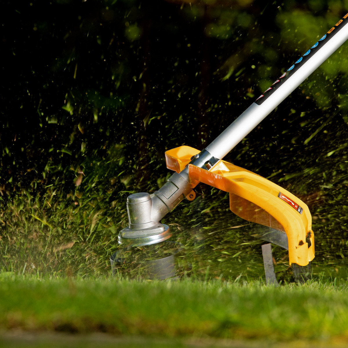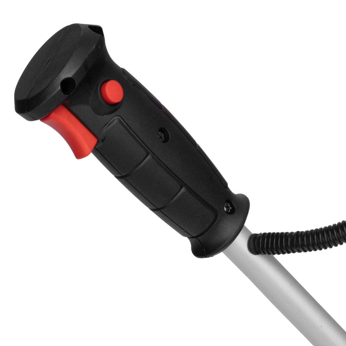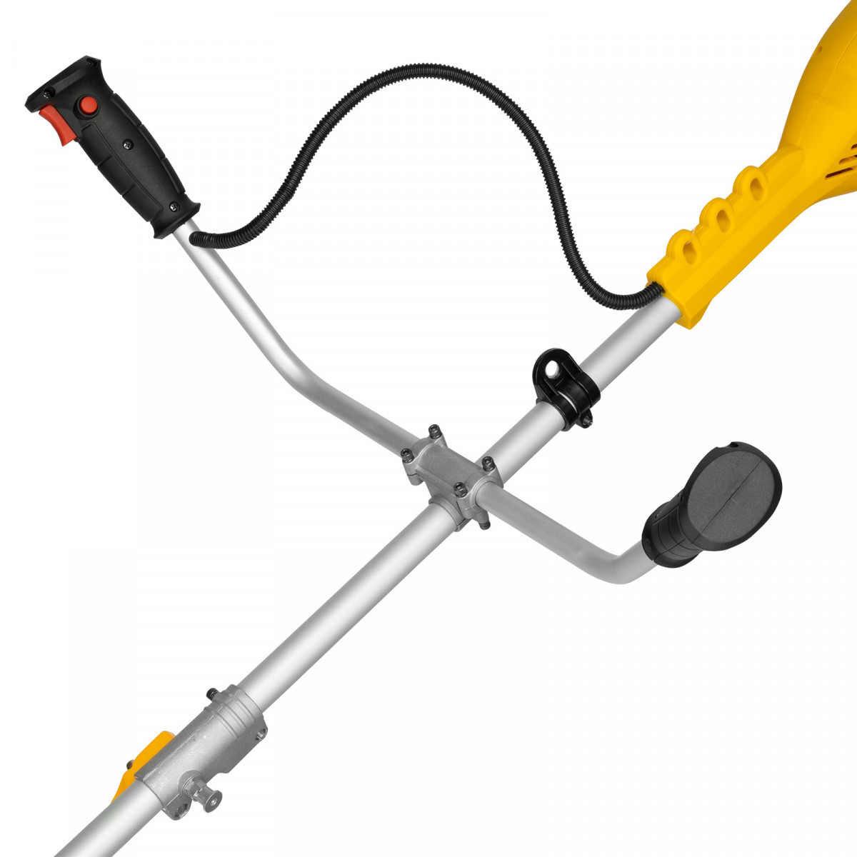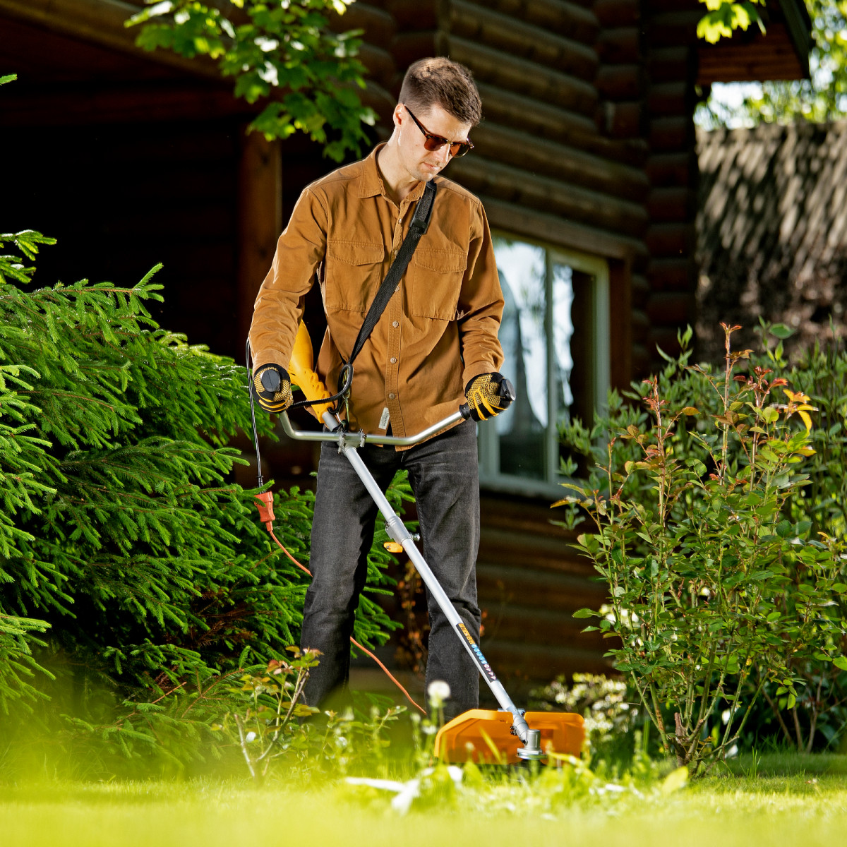 - Удобное управление — благодаря плечевому ремню, регулируемому кольцу крепления и велосипедным рукояткам триммер легко удерживать и направлять.