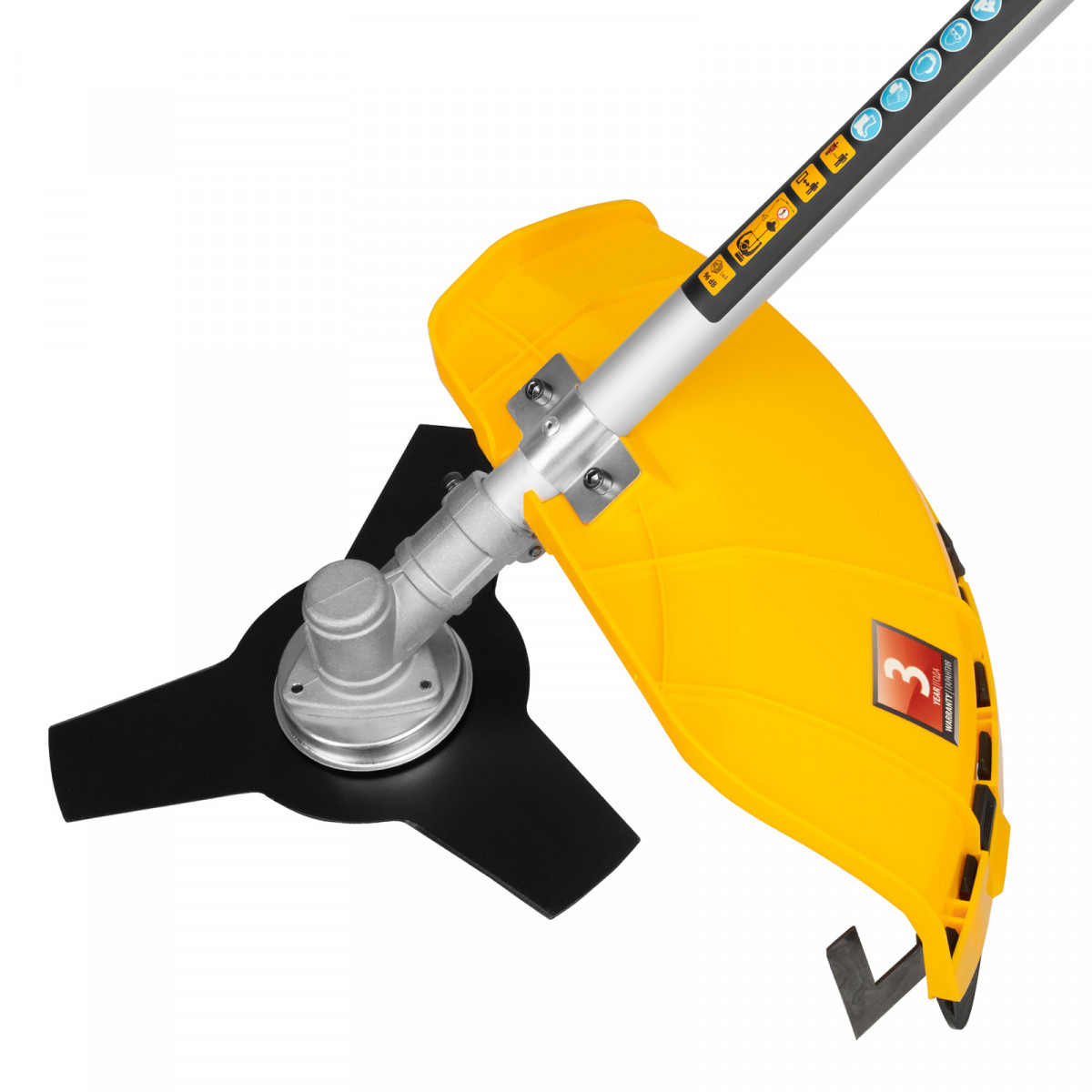 - Безопасность — специальный кожух защищает пользователя от вылета травы, камней и щепок.