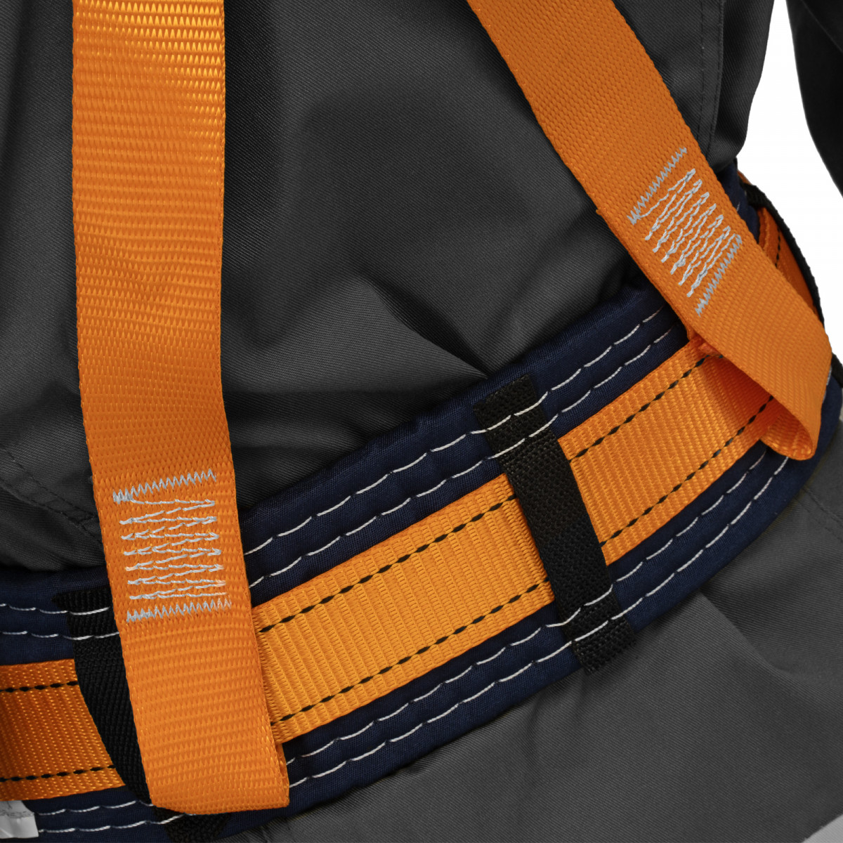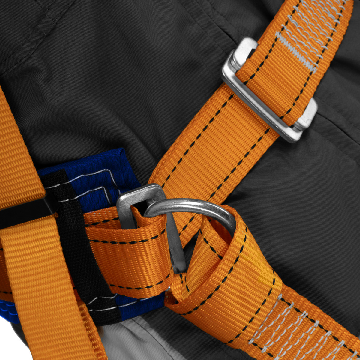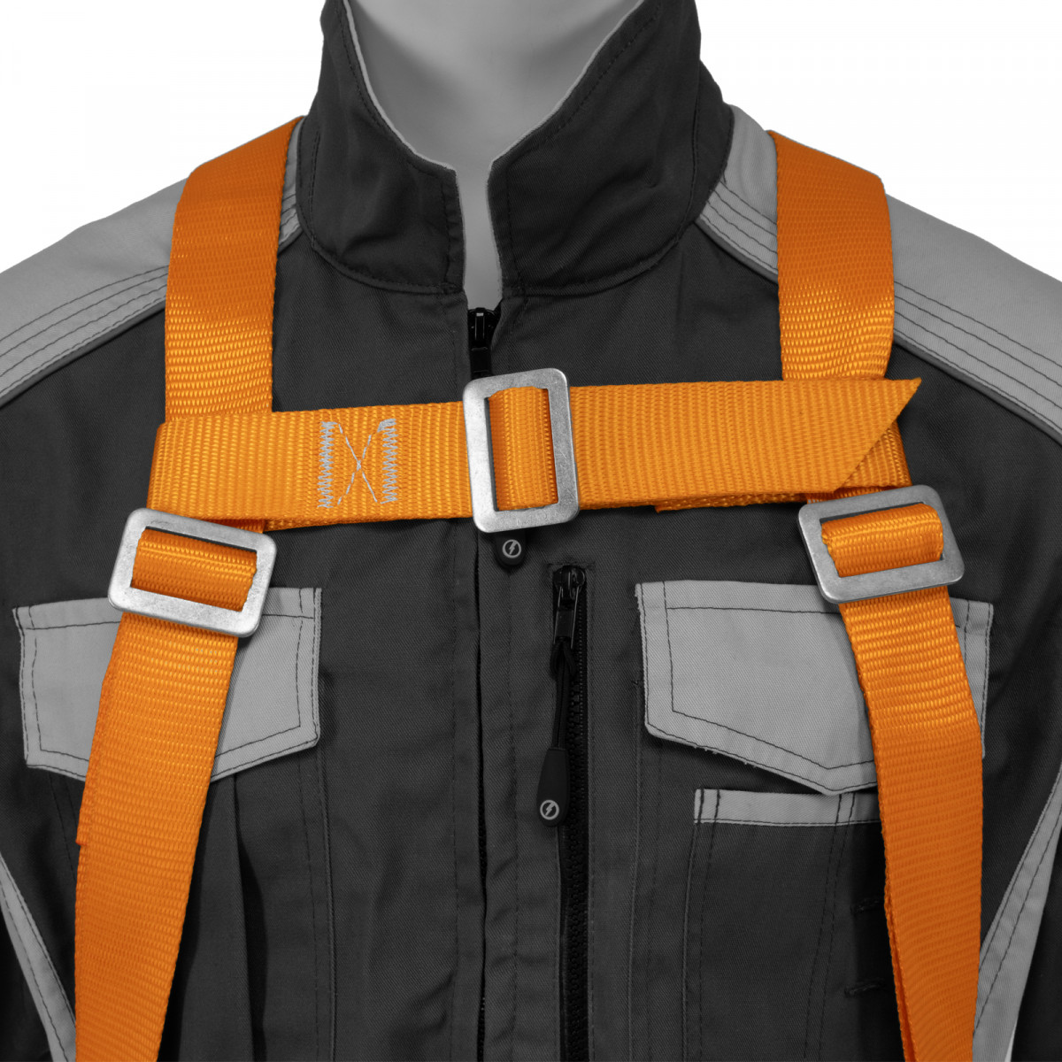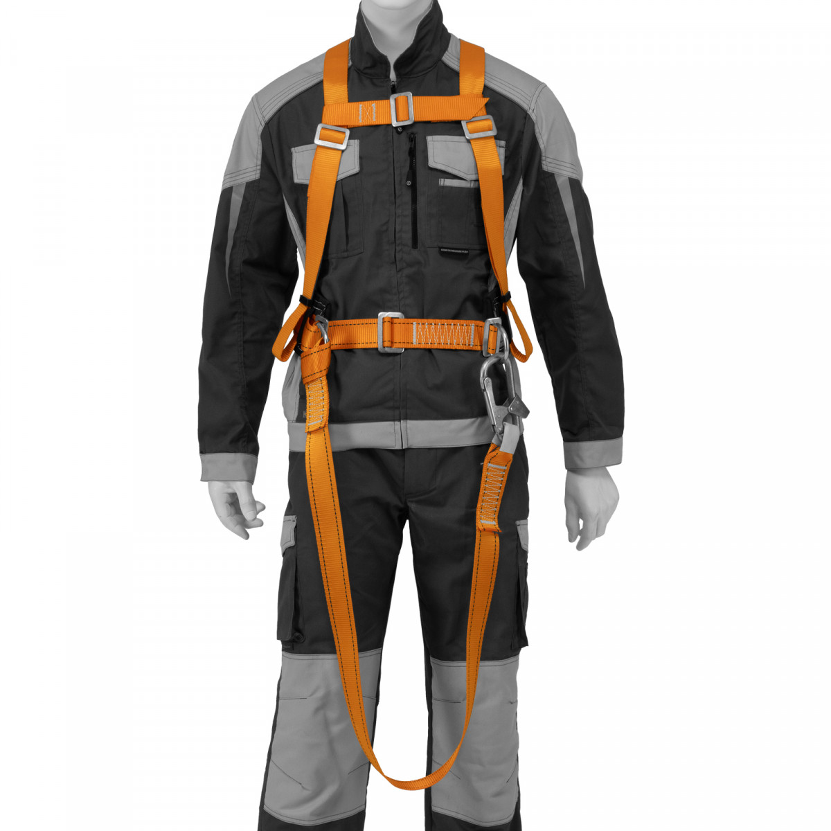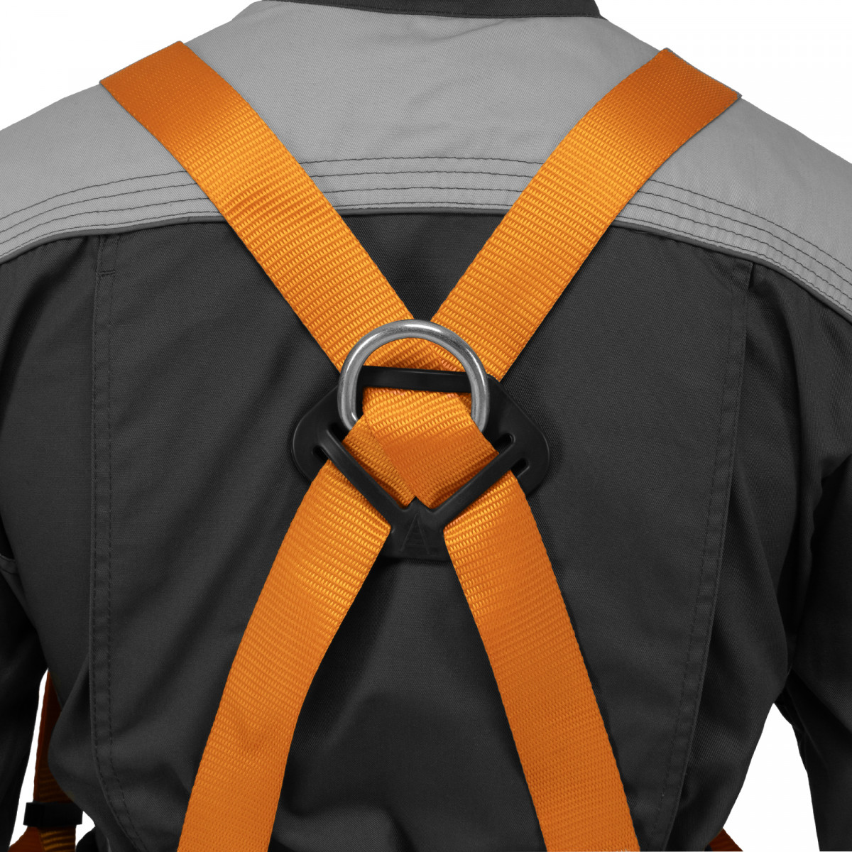 • Надежность — большой монтажный карабин, 2 металлических D-образных кольца на поясе и 1 на спине гарантированно удерживают пользователя.