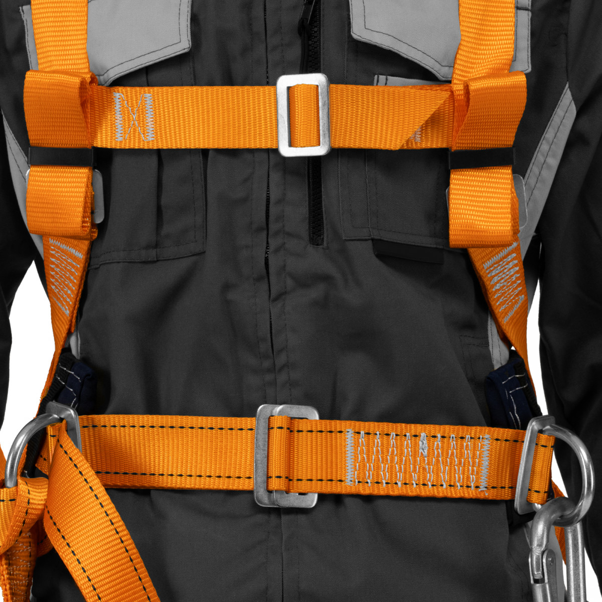 - Надежное крепление — привязь имеет 2 прочных D-кольца на поясном ремне и одно на спине, а также большой монтажный карабин.