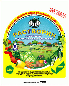 "Растворин" - комплексное водорастворимое удобрение с полным набором элементов питания, предназначенное для выращивания культур в открытом и закрытом грунте, в том числе и для малообъемных технологий выращивания овощей и капельного орошения садов.