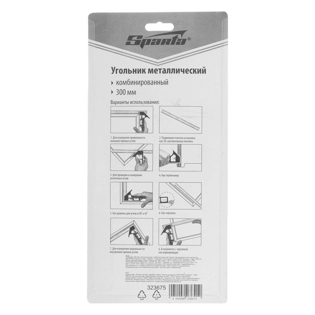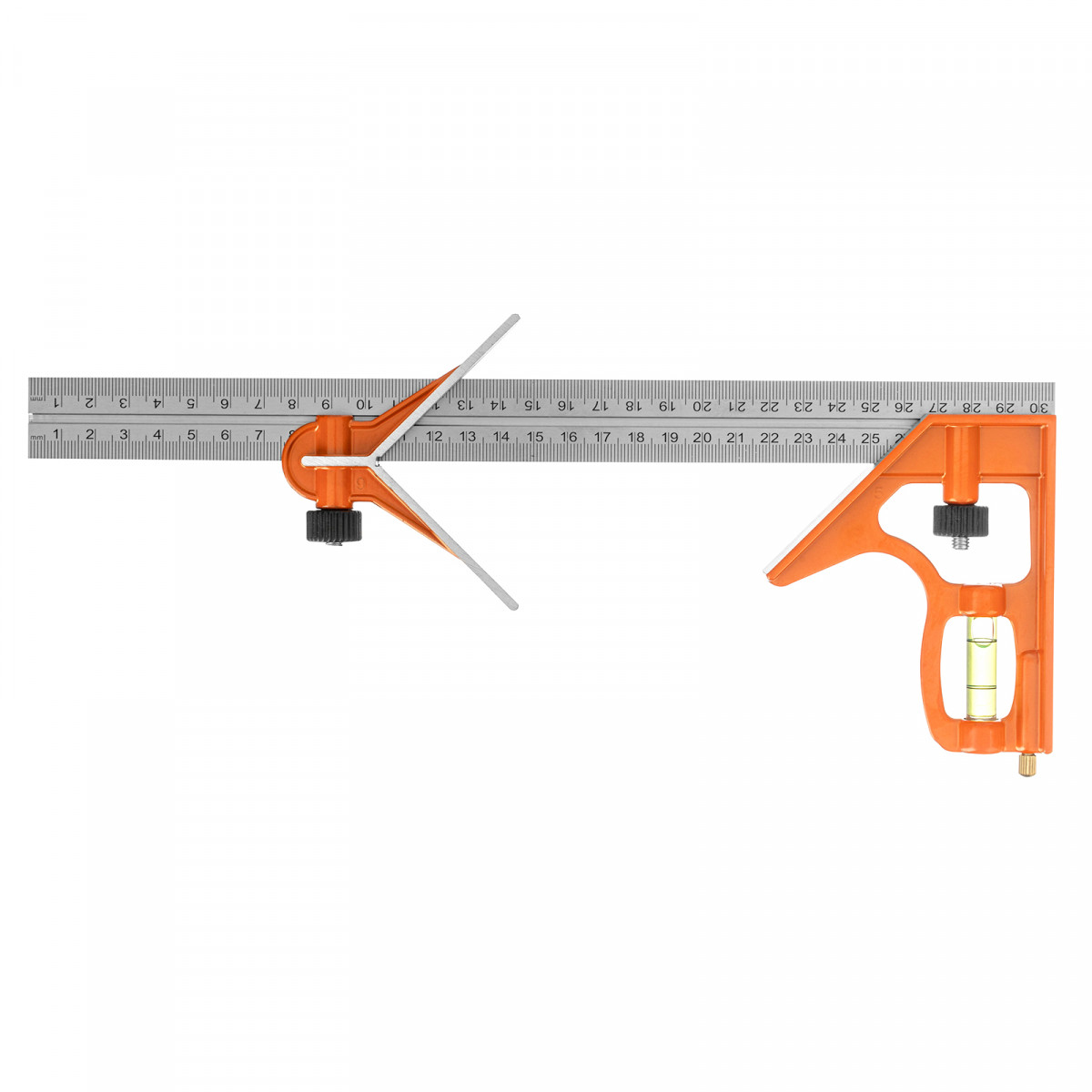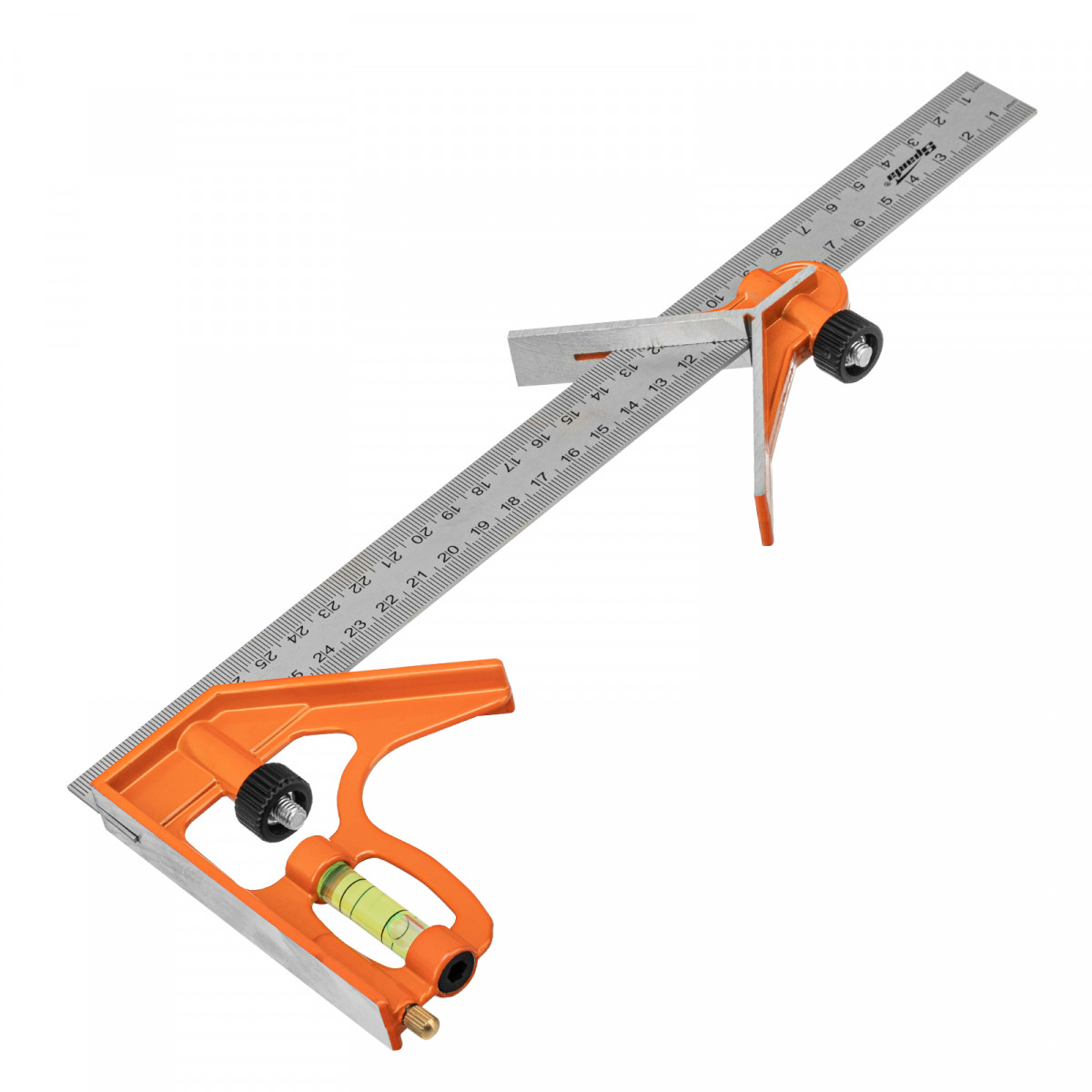 Комбинированный металлический угольник Sparta 323675 длиной 300 мм используется для разметки поверхностей и проверки точности углов 45° и 90°. Пригодится для выполнения столярных работ, а также для плоскостного контроля во время строительства.
