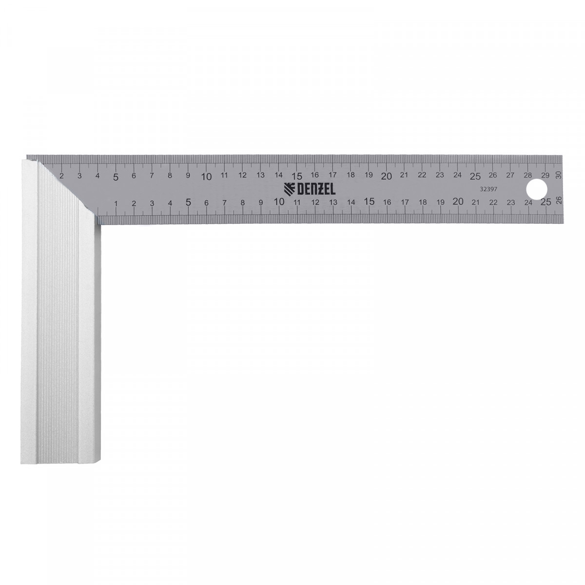 Стальной угольник Denzel 32397 длиной 300 мм, с градуировкой, алюминиевым основанием и полотном из нержавеющей стали, используется для построения и контроля углов. Будет полезен для выполнения столярных и строительных работ.