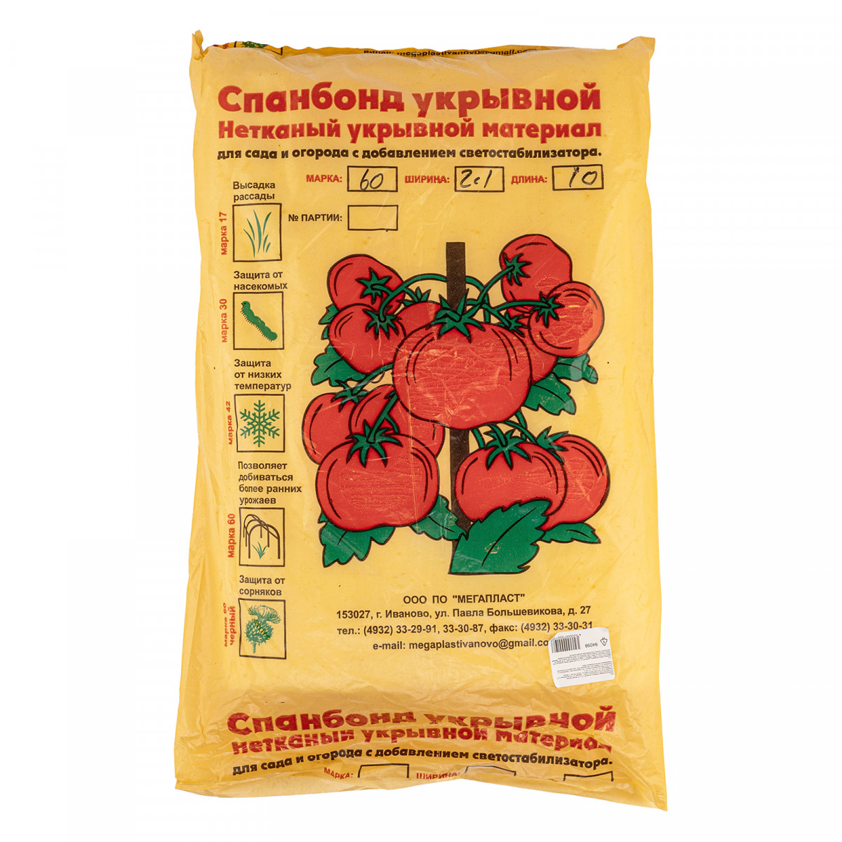 Укрывной материал Спанбонд эконом 94098 белого цвета, плотностью 60 г/м2, размером 2,1 х 10 м, предназначен для защиты растений от вредителей и неблагоприятных погодных условий. Материал хорошо удерживает тепло и используется в сельском хозяйстве для строительства теплиц.
