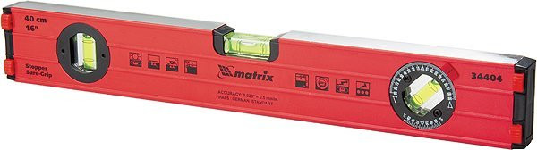 Усиленный профиль с двумя фрезерованными измерительными поверхностями и ребрами жесткости. Пластиковые заглушки на концах имеют резиновые вставки, предотвращающие скольжение при измерениях на наклонных плоскостях. Модель имеет три акриловых глазка для проверки отклонений по горизонтали, вертикали, а также регулируемый глазок для выверки произвольных углов. Точность измерений – 0,5 мм м (0,029 градуса).