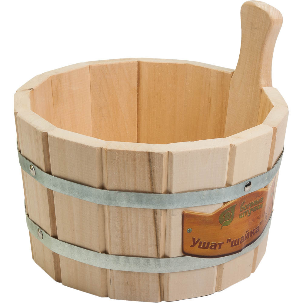 Ушат для замачивания веника или других банных процедур, не боится воды. Корпус ушата состоит из металлических обручей стянутых клепками и оснащен одной ручкой для более удобного использования. Объем 5 л.