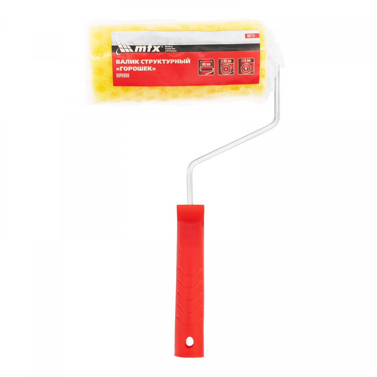 Структурный поролоновый валик MTX 80215 «горошек» 180 мм с ручкой диаметром 6 мм, диаметром ролика 80 мм, предназначен для декоративной отделки стен, потолков, фасадов и других поверхностей. Он подходит для нанесения водно-дисперсионных фактурных красок, декоративной штукатурки, жидких материалов без содержания химических растворителей и щелочи. Небольшие отверстия в поролоновой шубке позволяют создать оригинальный узор на поверхности. Валик прост в применении и не требует владения профессиональными навыками.