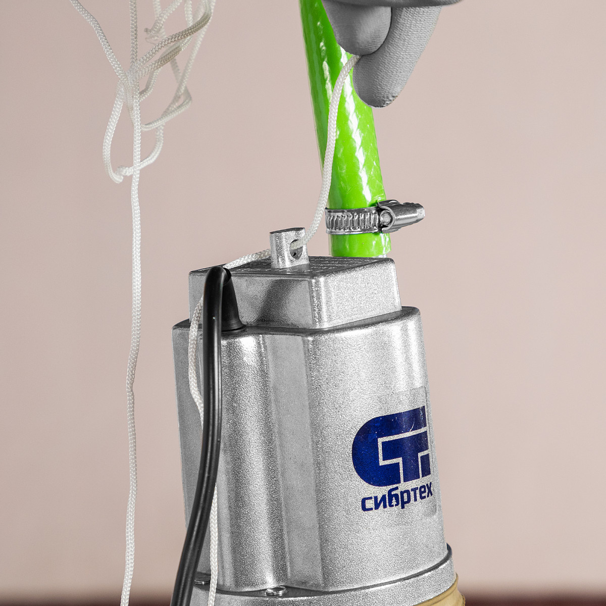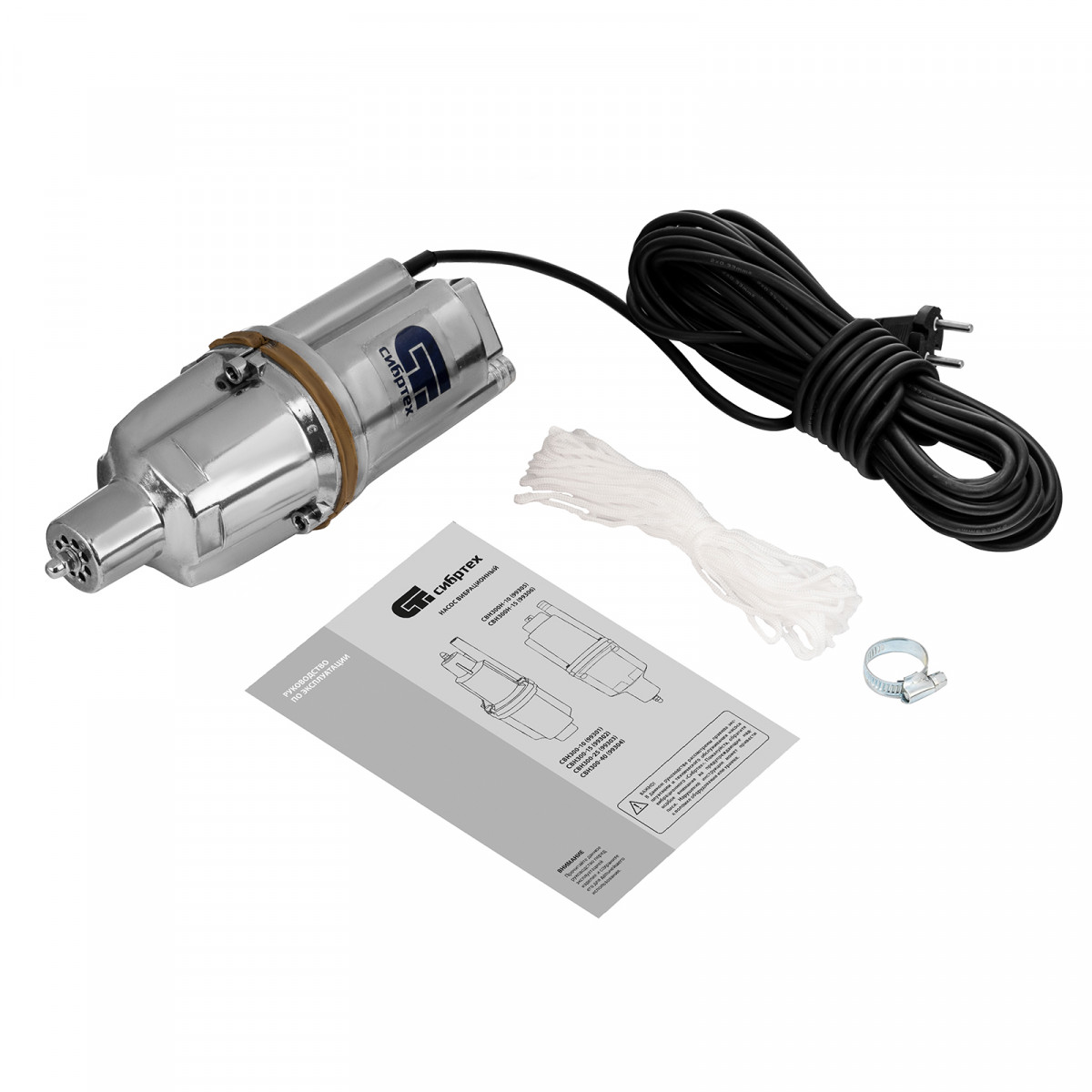 • Необходимые аксессуары в комплекте — трос для установки и хомут для подключения шланга прилагаются к насосу.
