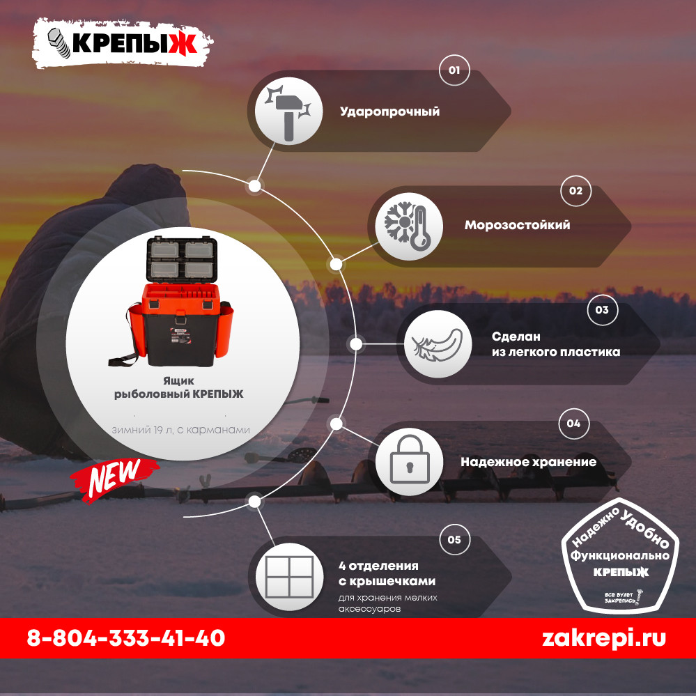 Ящик зимний рыболовный торговой марки КрепыЖ, изготовленный из ударопрочного, морозостойкого и в то же время легкого пластика, обеспечивает надежное хранение и транспортировку рыболовных снастей. Благодаря объему 19 литров, ящик вместит очень много полезных снастей для рыбалки. Основной отсек предназначен для переноски рыболовных снастей, термоса, так же удобен для перевозки улова. На внутренней стороне крышки размещены 4 отделения с полупрозразчными крышечками для хранения мелких аксессуаров.
