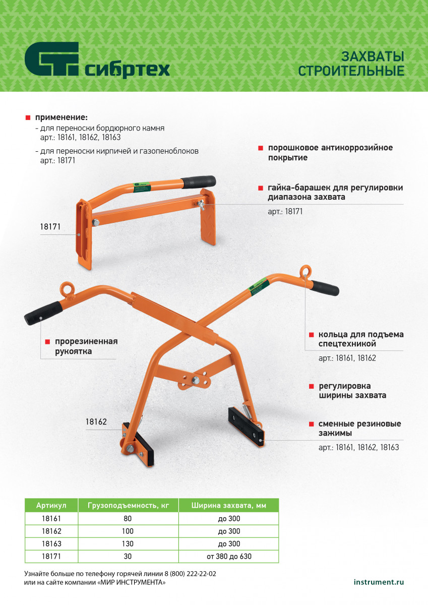 Ручной захват для бордюрного камня Сибртех 18161 — удобный и надежный инструмент, применяемый для установки дорожных бордюров, поребриков, бортового камня массой до 80 кг. Ширина захвата регулируется и может достигать 300 мм, что облегчает работу со стройматериалами разного размера.