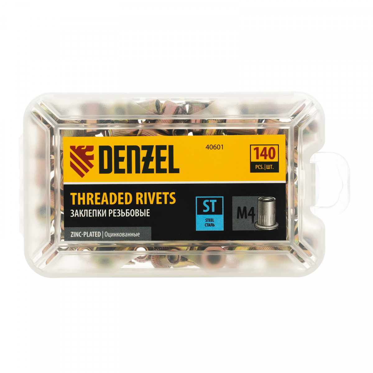 Заклепки резьбовые, стальные, оцинкованные, М4, пластиковый кейс, 140 шт. Denzel