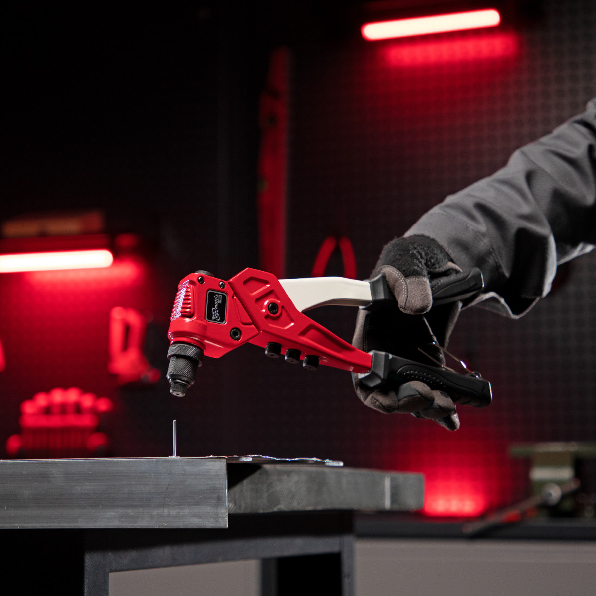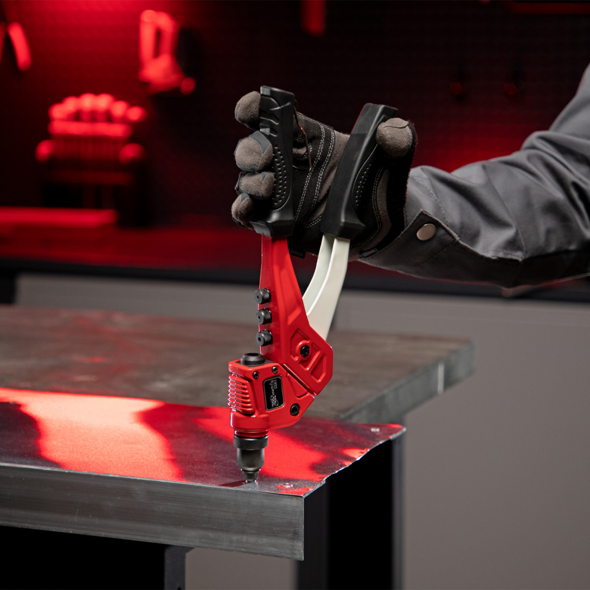 - Надежная конструкция — трехсегментный зажимной механизм изготовлен из высокопрочной хромомолибденовой стали и крепко удерживает вытяжную шпильку заклепки.