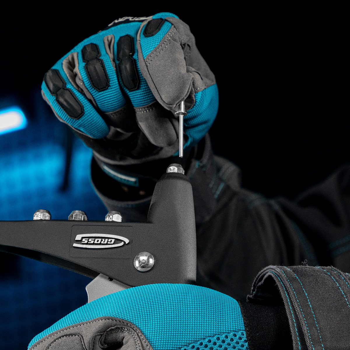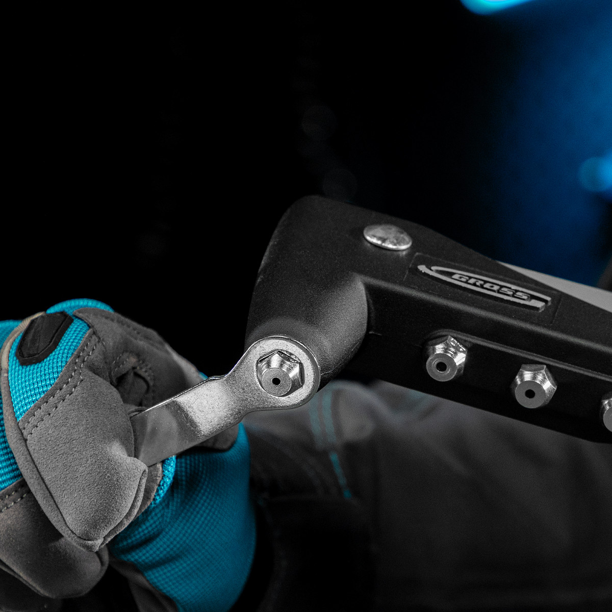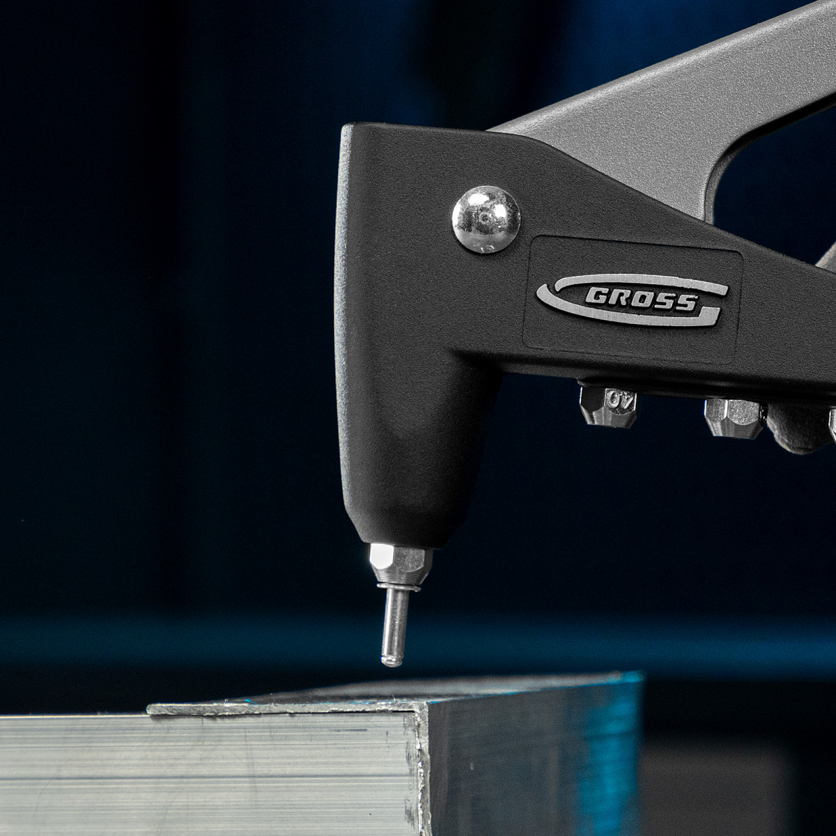 Литой заклепочник Gross 40401 надежно соединяет листовые заготовки при помощи алюминиевых и стальных заклепок размером от 2,4 до 4,8 мм, а также заклепок из нержавеющей стали диаметром 2,4-3,2 мм. В комплекте имеются сменные головки соответствующих размеров. Неиспользуемые насадки располагаются в корпусе инструмента, а значит, не придется тратить время на их поиск. Заклепочник рекомендован для профессионального применения, а также может быть полезен в быту.