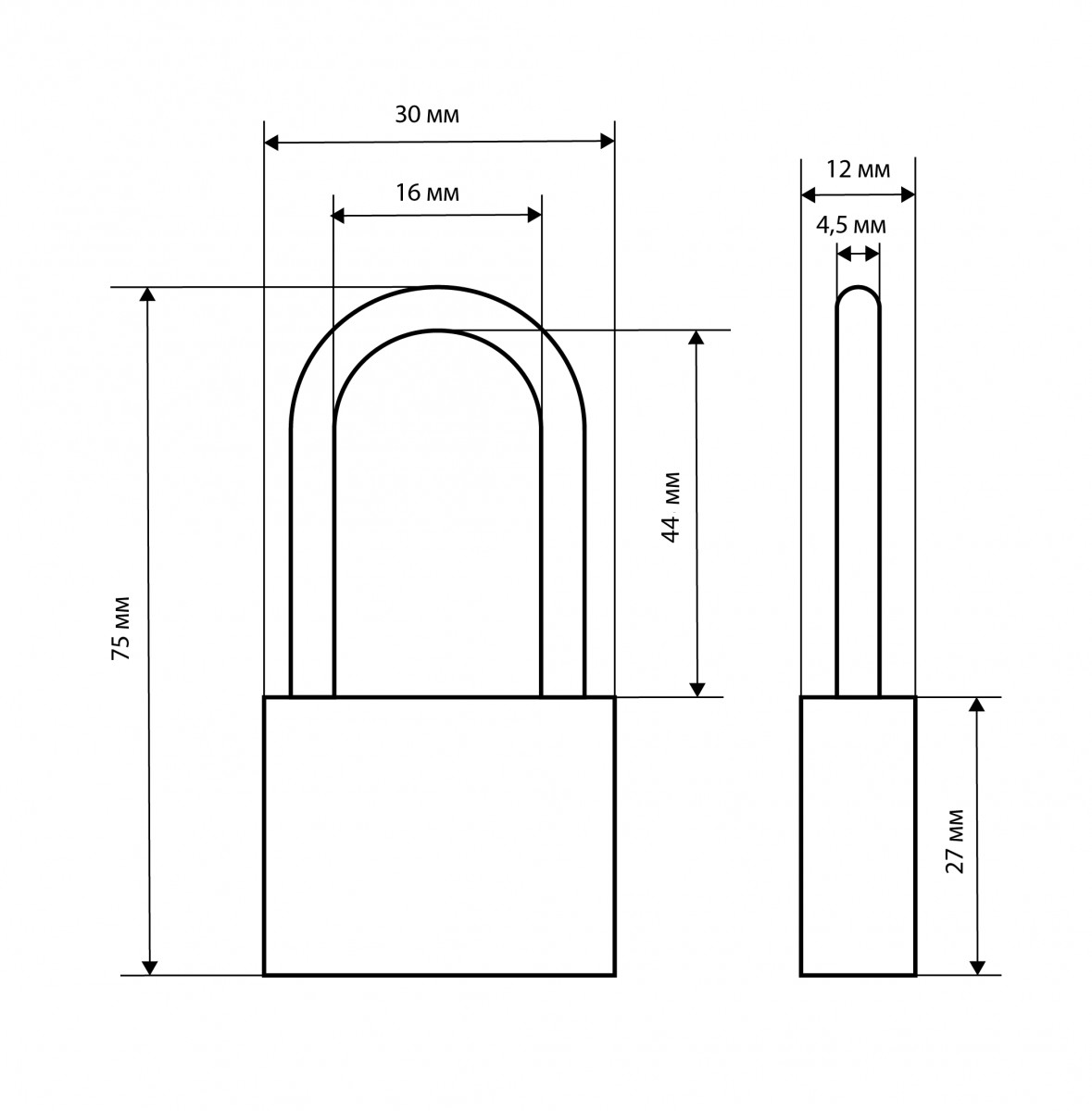 Замок навесной цилиндровый общего применения. Материал корпуса - чугун. Закаленная стальная дужка диаметром 4,5 мм; проем дужки - 44 мм по высоте и 15 мм по ширине. Габариты корпуса - 30х27 мм. Комплектуется 3 английскими ключами. Замок имеет функцию автоматического закрывания. Материал: чугун/сталь. Цвет: серый. Тип механизма секретности: цилиндровый, английский ключ. Запирание: автоматическое. Закаленная дужка : да. Количество ключей: 3. Диаметр дужки: 4,5 мм.