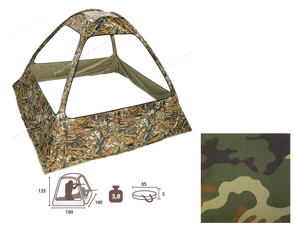 Засидка с сеткой Маскирующее укрытие для охотников при выжидании зверя и птицы с автоматическим принципом быстрой сборки/ разборки Комплектность: палатка, накидка маскировочная, сумка- упаковка Главной отличительной особенностью является быстрота и легкость сборки/ разборки, позволяющей взрослому человеку установить засидку за считанные минуты без особых усилий Имеет форму усеченной пирамиды с крышей Представляет собой тканевую палатку, плотно натянутую, за счет жестко закрепленного каркаса, которая при сборке/ разборке легко скручивается в кольца Со всех четырех сторон окна-бойницы, расположенные на расстоянии 0,45м. от земли, которые одновременно выполняют роль входа Крепление на месте осуществляется через металлические полукольца для колышек Накидка накрывает палатку сверху